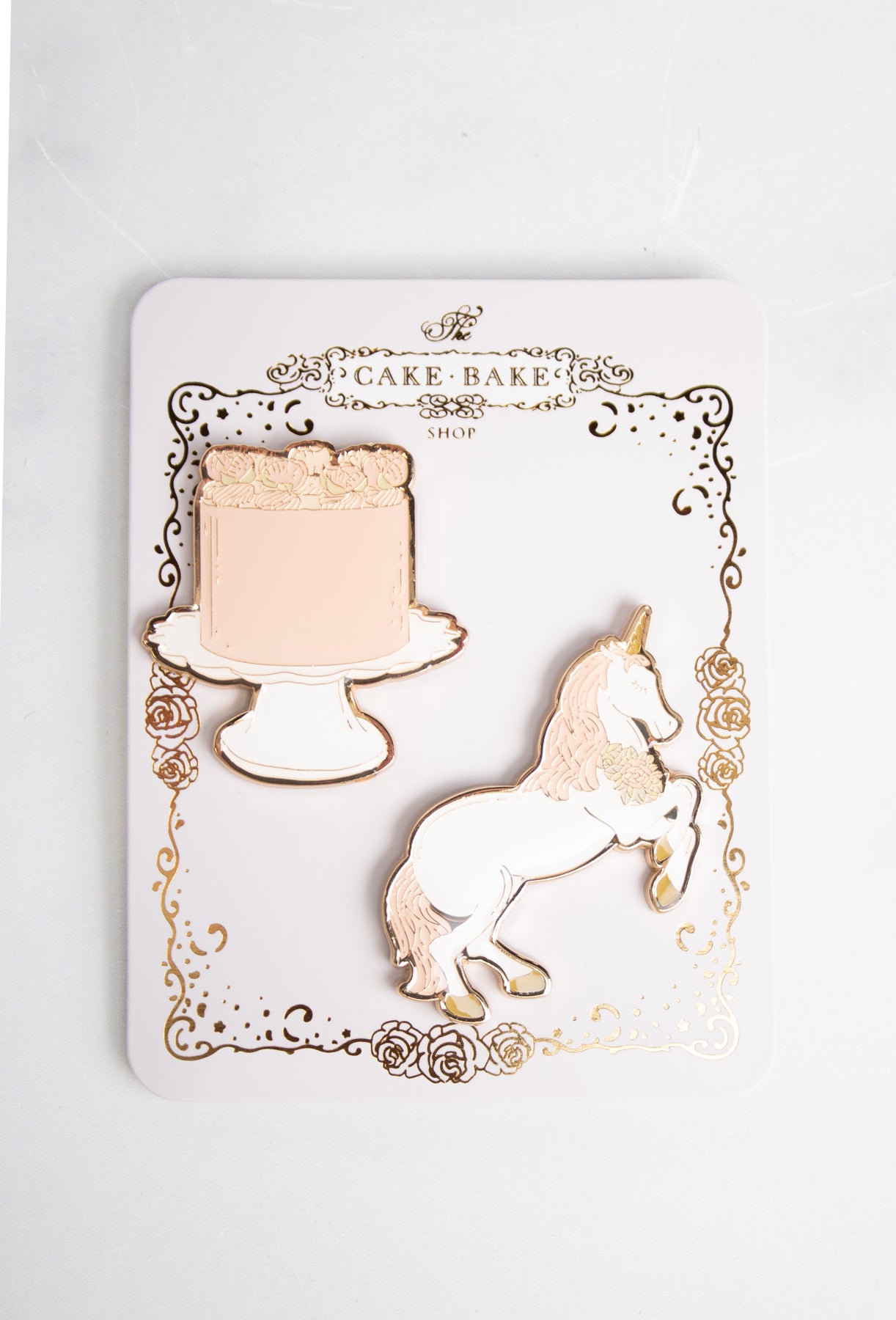 The Unicorn pin features a playful pink and white design adorned with shimmering pastel flowers and a golden border. The Neapolitan Cake pin is a three-tiered pink cake topped with strawberry buttercream and delicate florals.